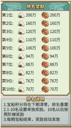 4、宝船,每五天会开放一次,每次持续3天,获得的姬魂数量越多则排名会越靠前,获取的奖励也会很多。