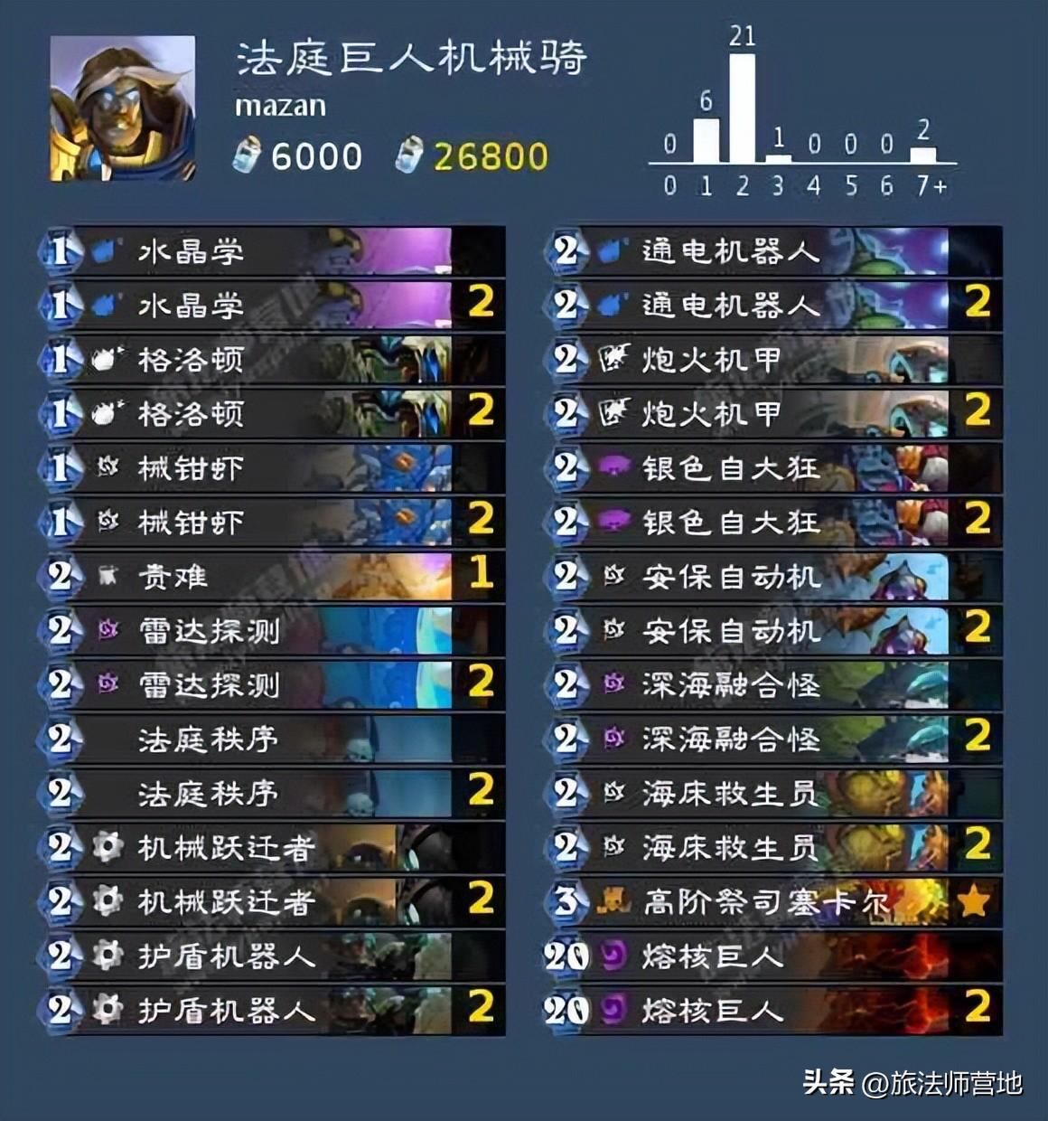 卡组特色:用法庭秩序把卡组排序,上层结构是熔核巨人+高阶祭司塞卡尔+银色自大狂,下层结构是机械跃迁者+小机械。法庭秩序排序后再使用探测雷达的思路可以解放卡组机械随从投入数量限制。