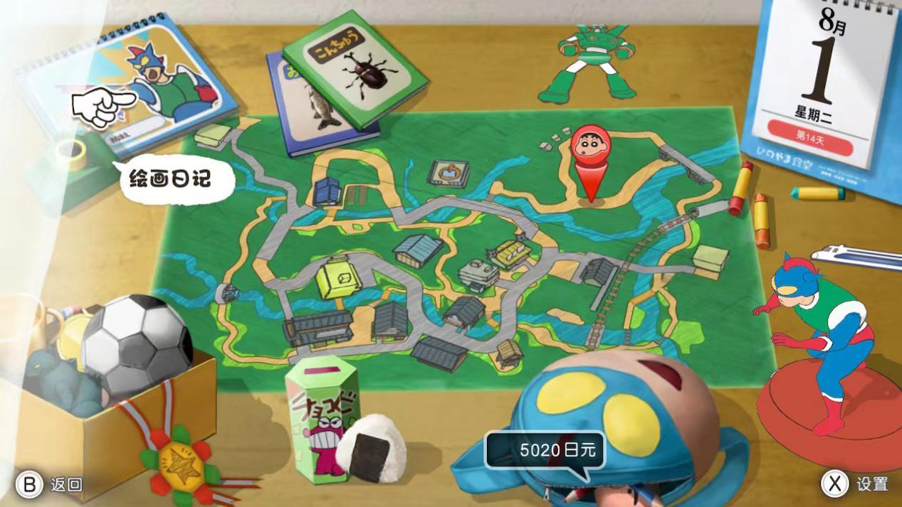 除了夏日必备的捕虫、钓鱼、摘野菜、照顾农田等传统活动外,你还可以看到小新为了购买零食,帮助大人们跑腿;或是和当地的孩子们一起,聚集在“秘密基地”进行恐龙机器人间的对战;再或是为了与女大学生约会,成为当地报社的儿童记者。而《我的暑假》系列传统要素的“绘图日记”和“昆虫相扑”,都以一种新的形式在本作中得到了继承,小新会将每天遇到的事情,以绘图日记的形式记录下来,供玩家随时回顾。