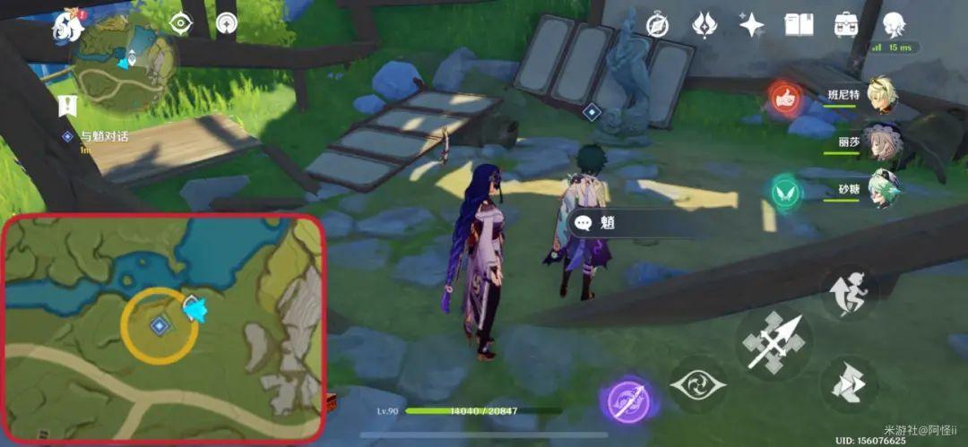 3、在附近发现王平安被两只丘丘人包围起来了,只要将丘丘人打败即可自动触发与王平安的对话