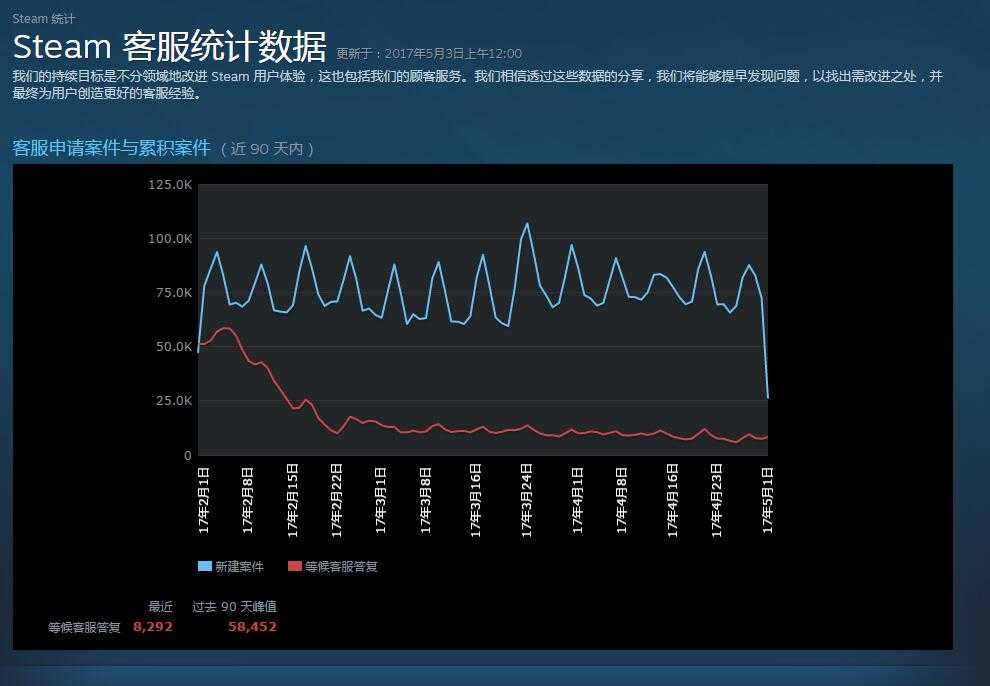 同时,从这个页面中我们也能看出一些有趣的数据。比如蓝色的曲线是用户发出请求的数量,明显能看到它呈现出十分有规律的波动,仔细对比就会发行低谷一般是每周的周三或者周四,高峰一般是每周的周六。与此同时,Steam 客服每天能解决的客服请求数量通常在7.5万左右,而且一般在几小时内就会完成。