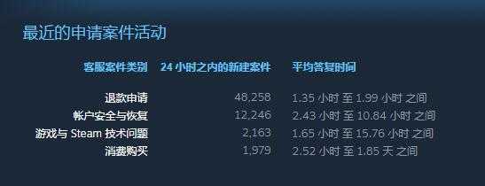 在这个页面上,我们能看到最近90天内容 Steam 整个平台收到的客服请求总数,种类,目前正在等待处理的数量,以及已经完成请求的数量等等。而根据这个数据,Steam 还列出了不同类型的客户请求的平均解决时长,帮助用户对时间进行预估和对比。
