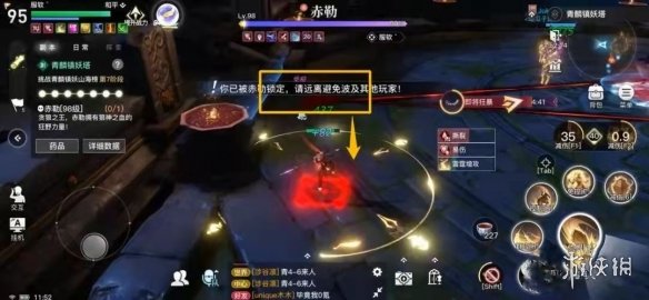 被奔狼闪点名的两个玩家,身上连着的线过几秒后连线位置会固定,之后要立刻远离线的位置,因为这个时候BOSS会沿着线进行攻击,所以任何玩家都不能站的太近。