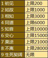 未结契的玩家亲密度上限为6000,结契后可以提升亲密度等级从而获得更高上限,从同道 开始,玩家需要完成相应的升级任务才能继续提升关系阶段到知音,到达知音阶段之后需要结契关系才能继续提升亲密度。