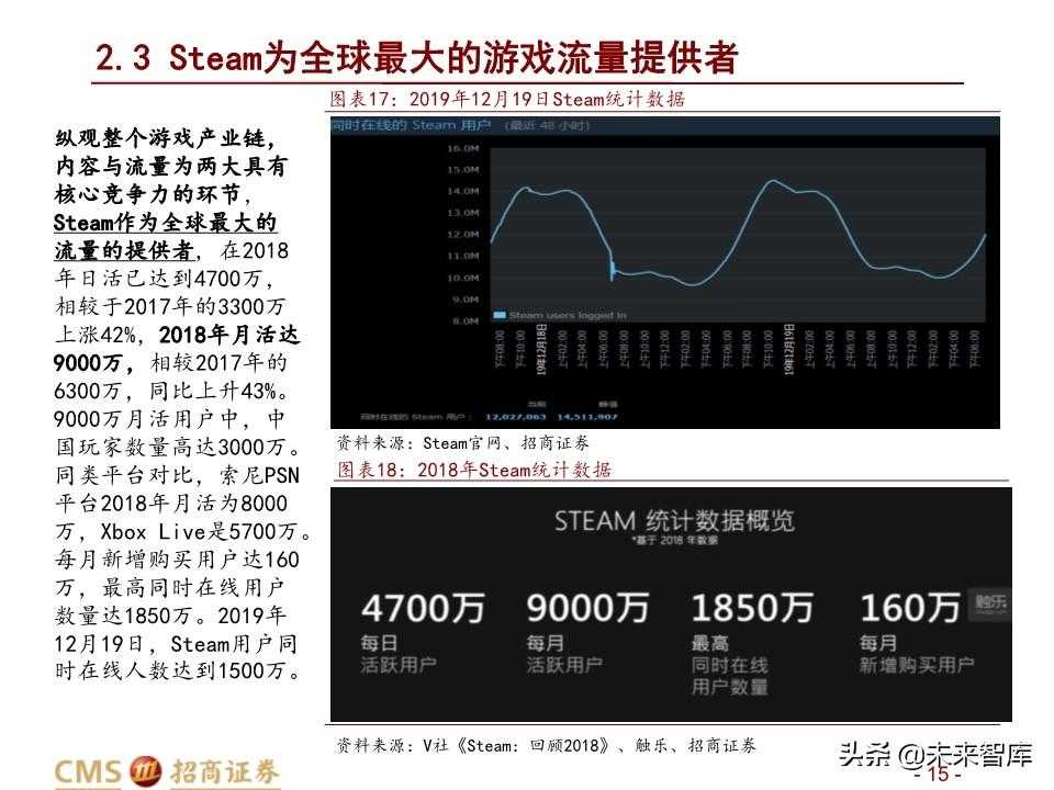 纵观整个游戏产业链, 内容与流量为两大具有 核心竞争力的环节, Steam作为全球最大的 流量的提供者, 在2018 年日活已达到4700万, 相较于2017年的3300万 上涨42%,2018年月活达 9000万,相较2017年的 6300万,同比上升43%。 9000万月活用户中,中 国玩家数量高达3000万。 同类平台对比,索尼PSN 平台2018年月活为8000万,Xbox Live是5700万。 每月新增购买用户达160 万,最高同时在线用户 数量达1850万。2019年 12月19日,Steam用户同 时在线人数达到1500万。