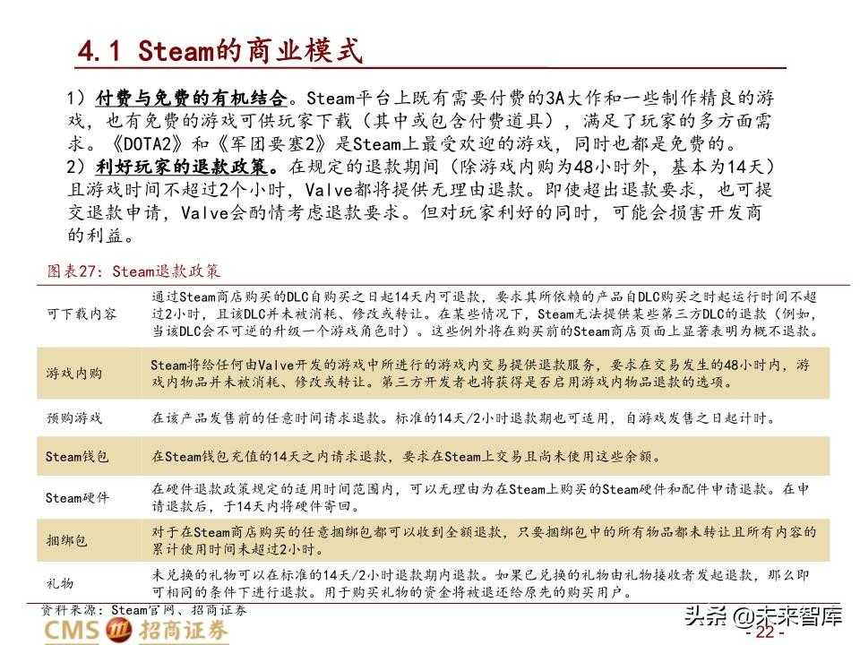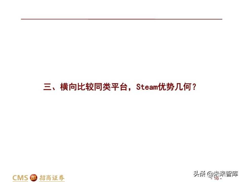 4)Steam平台具有自己的社交属性,社区运营方面,Steam的社区功能经过多年以来的改版, 已经成为了一个集玩家组群、主页、讨论、创意工坊、市场、实况直播等内容为一体的交流 平台,并且通过功能的衍生和模拟社会活动的扩展,提升了用户的使用体验。