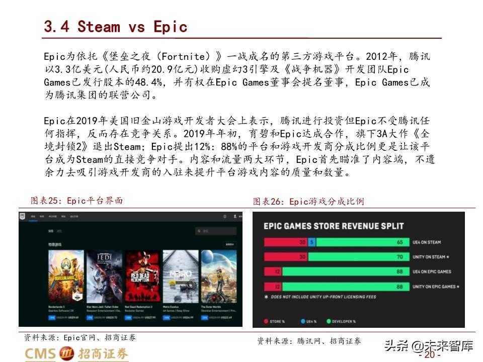 Steam的竞争对手Epic实行1.2:8.8的分成比例,Discord则在2018年宣布提供1:9的分 成比例,一定程度上对Steam造成了冲击。因此,2018年12月1日,Steam为照顾部分大 厂游戏开发商,调整了游戏收入分成比例,分为三个等级,纵观整个行业30%的分成比 例符合行情。腾讯旗下WeGame的分成比例也是30%。