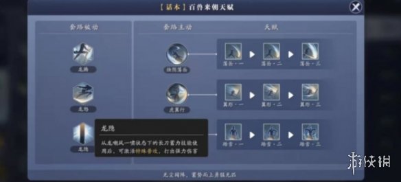 嘲风一啸:消耗所有龙芒进入20秒长刀状态,强化2、3技能。强化后的2、3技能与原技能CD不共用。2技能强化为【裂蒲牢】,长按蓄力后跳斩。3技能强化为【归重明】,长按造成多段伤害。且2、3技能释放后都会强化普攻,连放2个强化技能,强化普攻可以积累到一起释放。