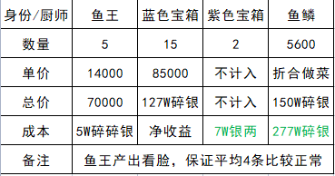 2)厨师钓鱼:鱼王产出增加后确实提高了不少,包括雪莲也是。鱼王比较看脸,不过平均4条问题不大,离谱的看到过一周8条鱼王。以每周5条鱼王为例,出售宴席菜可获得7W银两,另外蓝色结实的宝箱和鱼鳞都能折换成碎银,如果用心做菜一周通过钓鱼还可以获得300W碎银(虽然半下琢磨都点不到)。