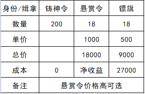3)捕快缉拿:缉拿的收益还得看悬赏令的价格,因为悬赏增加了金色神兵的掉落,每个区悬赏令都有不同浮动的提升。如果你们区悬赏令价格高于1500,是一个可以选择的身份,铸神令锦上添花。需要注意的是缉拿时候碰到【生擒首领】一定要手动,不然全部缉拿做下来得亏20%产出。