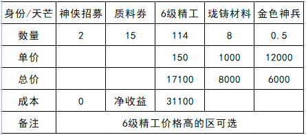 6)天芒开箱:在天芒8层以上开箱子,一共可以获得2个神侠招募令,15个质料券,114个6级精工,8~9个珑铸材料,和0.5个金色神兵。对于6级精工价格高的服务器来说,天芒是被忽略的好身份,精工高于200就能比大部分身份获得银两更多。
