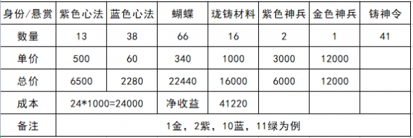 4)悬眼悬赏:悬赏改版后产出物品确实变多了,但是否值得做首先要看区里蝴蝶和悬赏令的价格来决定。另外珑铸材料以及神兵价格都影响着收益,蓝色心法对于老区也基本属于烂在手里。