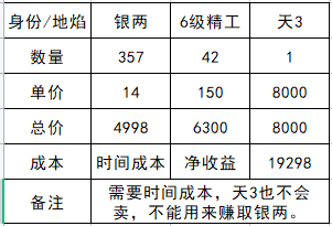 7)陨星地焰:一共5000银子,42个6级精工,大概率1个天3。天三实际价值在1W5,也就是2W5左右的收益。虽然没有成本但是收集14个金色材料的时间成本还是比较高的。