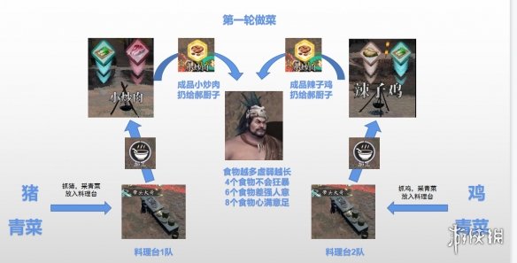 4)上菜员第一时间卸下加工好的菜肴对准扔给郝厨子。在前期可以把靠近自己的青菜扔给采集员(普通本地上的食材比较少)。