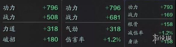 满级属性:减伤率&伤害率+1.2%,破招+180,力道&气劲+318,身法&根骨+158。