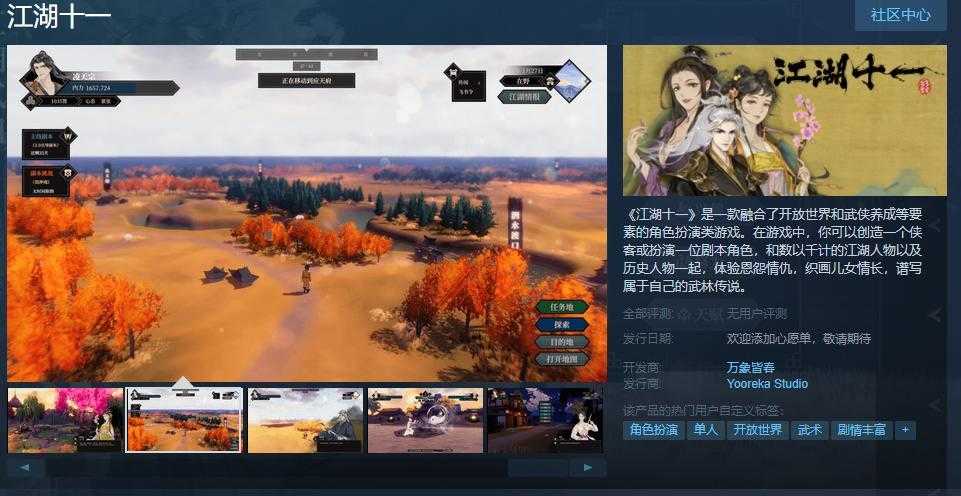 开放世界武侠养成RPG《江湖十一》现已上架Steam,该作由两人工作室“万象皆春”开发,Yooreka Studio发行,支持中文,具体发售日期和售价暂未公布。