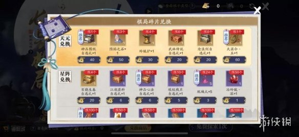 棋局碎片可以在七星棋局兑换商店内,兑换相应的珍品道具。不同种类的珍品道具可兑换数量、最高兑换次数均有不同,各位少侠可按自身需求进行兑换。