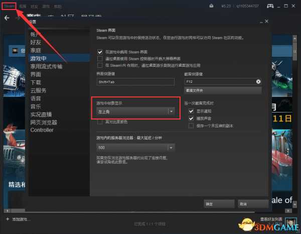 点左上角的Steam,然后按下图指示设置即可。