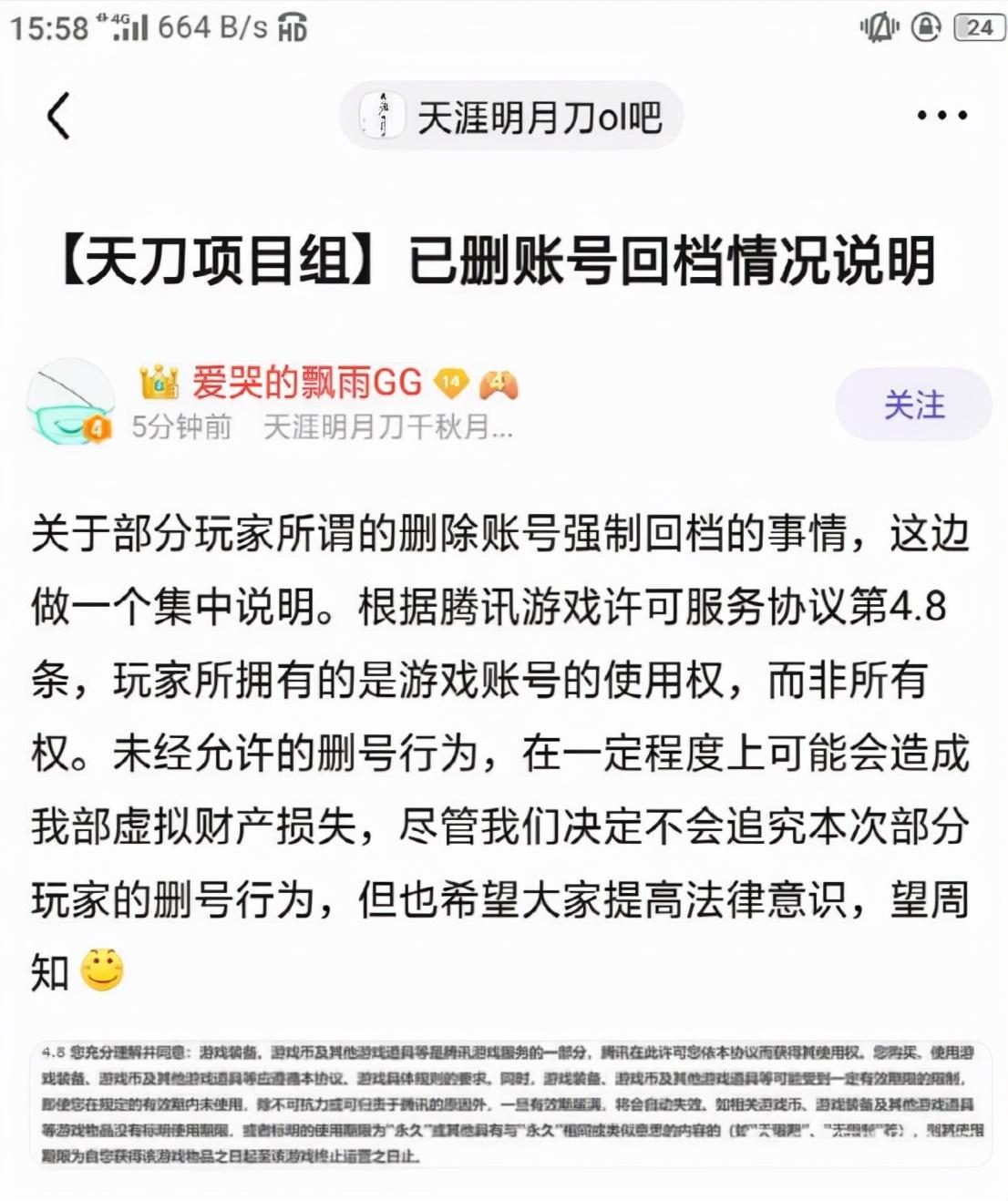 就在昨晚,云游姬所在的QQ群里忽然开始流传下面这张图,天涯明月刀ol大佬删号退坑,性感运营在线回档,以用户协议为由取消玩家删号的资格和权利。