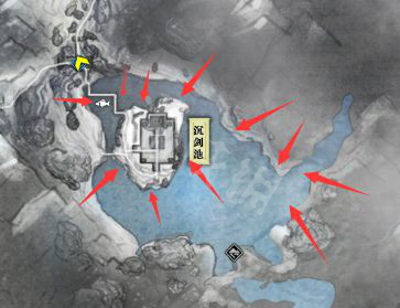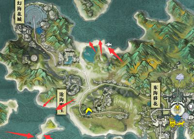 1、刷新地点:秦川沉剑池、移花岛沧海明玉,箭头处为常刷新地点,白色鱼就是鱼群。