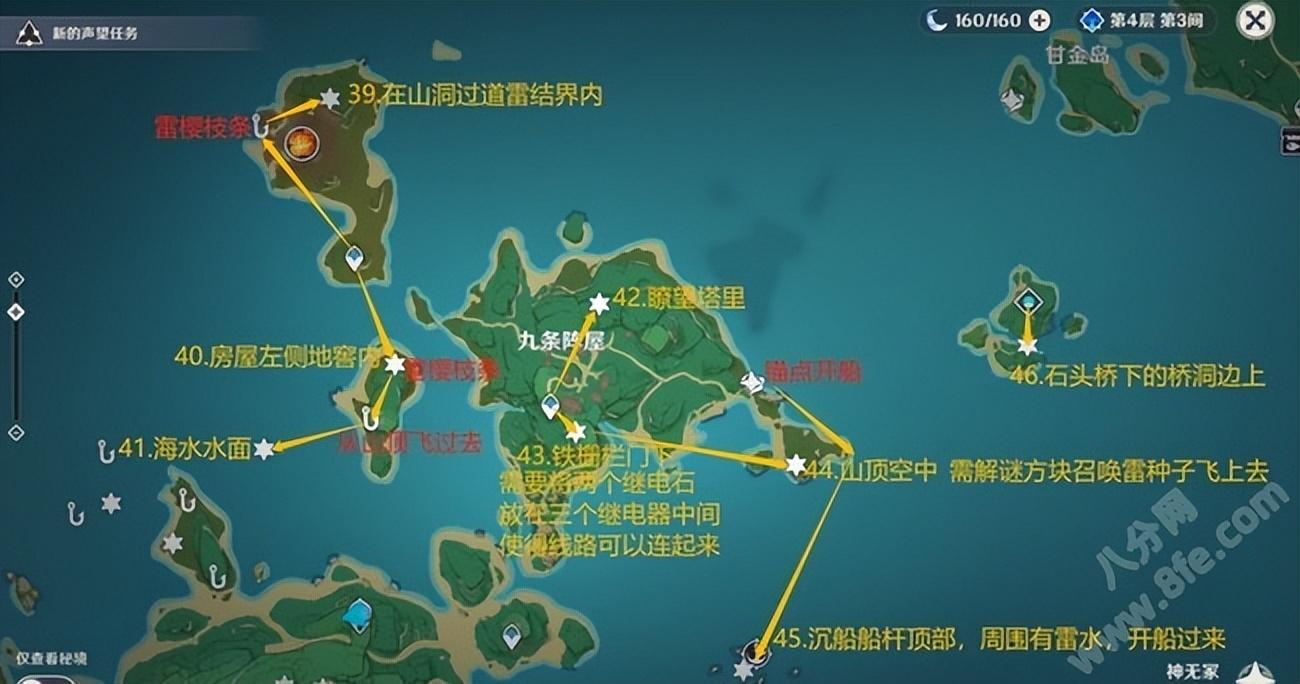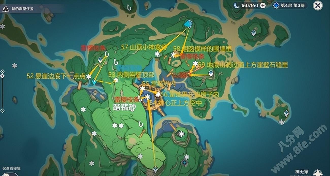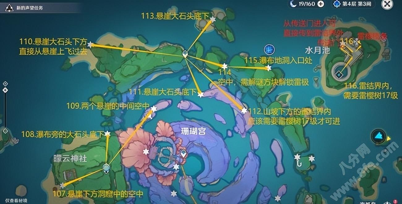 鸣神岛一共38个雷神瞳,有两个在雷结界内,需要雷樱树17级才能进入。