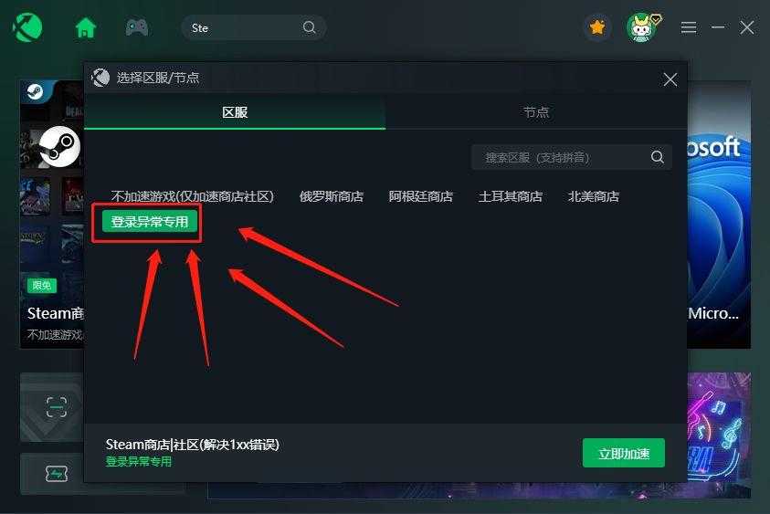 1.打开迅游加速器,搜索Steam商店并选择“登录异常专用”节点进行加速,迅游加速 器已针对Steam各种登录问题做了相关优化,加速之后能够解决玩家们遇到的大部分登录失败、登录异常等问题。