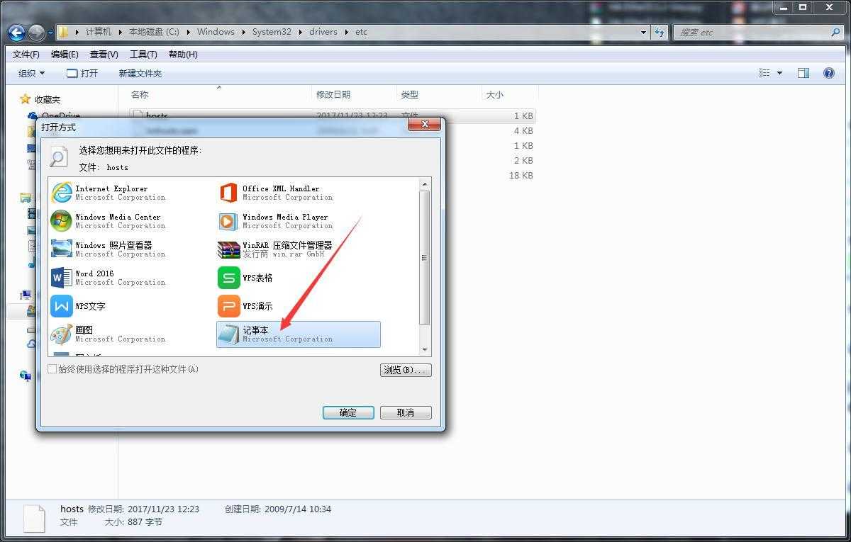 找出其中的hosts文件,并且选择右击文件以记事本的方式打开。