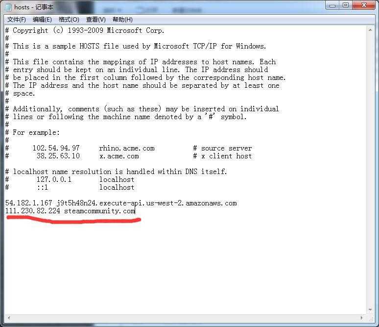 如果你的文件中已经有了steamcommunity.不过其前面的IP地址却不一样,那么你可以直接将IP地址删掉,复制上面的IP就可以了。