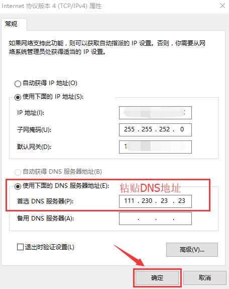 后面将图片中的“使用下面DNS服务器地址(E)”选择出来,将111.230.23.23贴贴到“首选DNS服务器(P)”,最后点击确认即可正常访问steam相关页面。