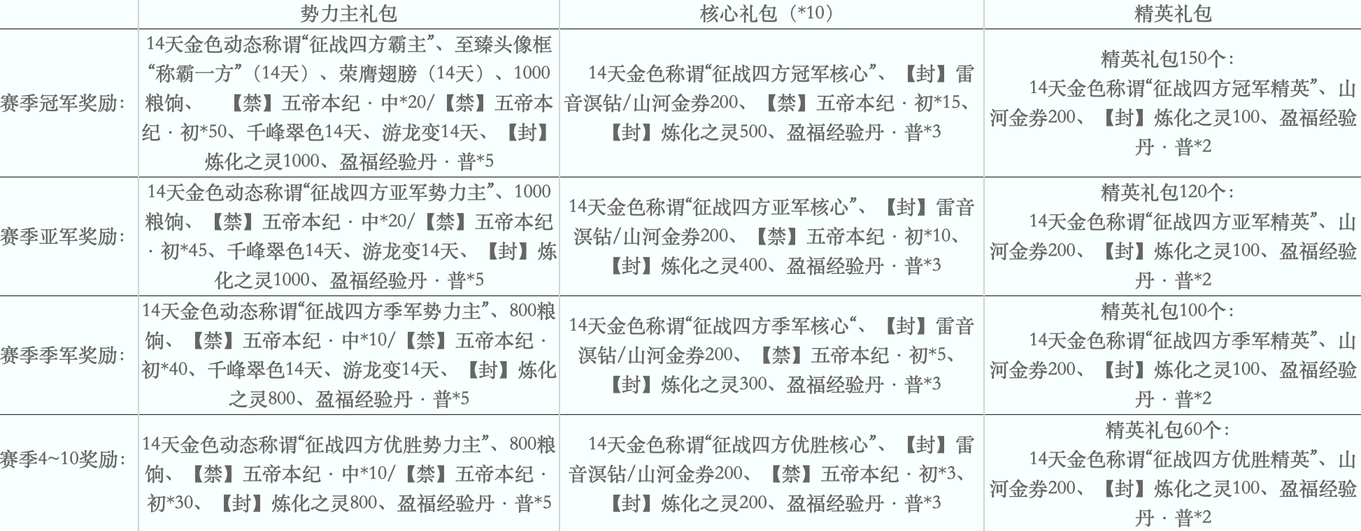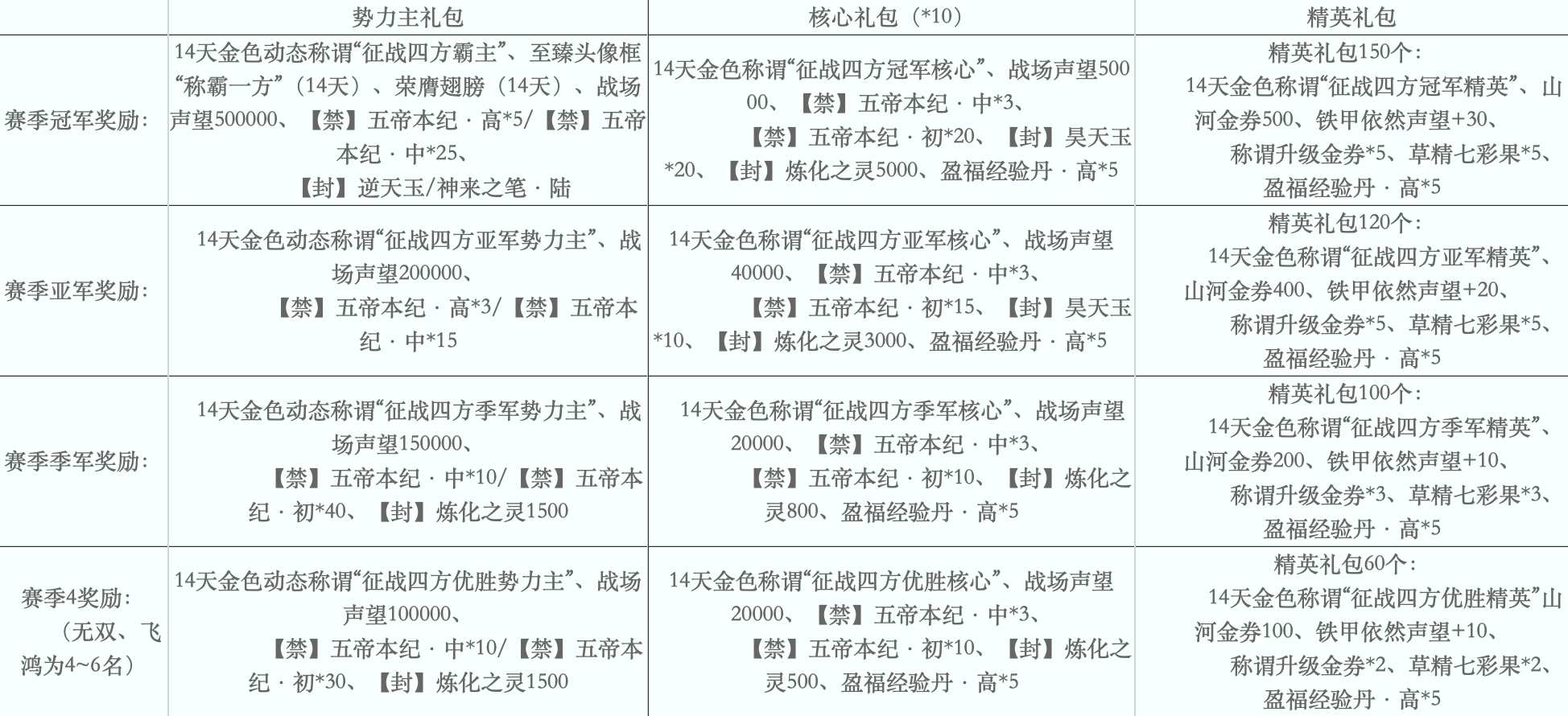 亲爱的《天下3》玩家: 为了保证服务器的稳定和服务质量,本周例行维护将于2022年9月14日早上8:00停机,维护时间为上午8:00至10:00左右。如果在维护期间无法完成维护内容,开机时间将继续顺延。 本次更新结束后,游戏客户端版本将从2.0.1050上升到2.0.1051,更新客户端后进入游戏。请各位玩家相互转告,并留意游戏时间,以免造成不必要的损失。对于停机期间给玩家带来的不便,敬请见谅,网易游戏感谢所有玩家的支持和配合。征战山海·大破四方 全新赛程,重新出发,征战山海,大破四方! 本周更新后,征战四方全新赛程开启。少侠会加入哪个势力一起征战山海,又会与谁并肩大破四方! 征战四方活动一共分为四个赛季,活动期间参加势力战、梦源城战、流光梦境、幻化流光可获得征战四方积分,每个赛季结束会根据当前赛季的征战四方势力总积分进行排名,排名前4的势力可获得征战四方优胜奖励。 本赛程的赛事日程如下: 周一:流光梦境、周二:流光梦境、周三:幻化流光、周六:势力战、周日:梦源城战一、活动时间: 第一赛季:2022年9月14日09:00-10月5日00:30 第二赛季:2022年10月5日09:00-10月19日00:30 第三赛季:2022年10月19日09:00-11月2日00:30 最终赛季:2022年11月2日09:00-11月16日00:30二、积分细则: 1、势力战:每占领一个祭天台可积5分 2、梦源城战:每周城主势力可积15分 3、流光梦境:每周一、周二根据流光梦境战击杀人数进行排名,根据势力排名给予积分。第一名8分,第二名7分,第三名6分,第四名名5分、第五至第十名3分。 (势力排名根据当日梦境击杀数量决定,击杀数相同根据势力伤害决定) 4、幻化流光:每周三根据幻化流光积分总数进行排名,根据势力排名给予积分。第一名15分,第二名12分,第三名9分,第四名6分,第五至第十名3分。 幻化流光积分根据当日活动完成情况给与积分,具体情况如下: 1)流光城战 参与城战,并且胜利的阵营,每个玩家可以为所在的势力增加3点流光积分 参与城战,并且失败的阵营,每个玩家可以为所在的势力增加1点流光积分 报名城战,但退出,没有正常参与的玩家,无法获得积分 2)流光谍报 玩家每完成一次流光谍报,可以为所在的势力增加2点正义流光积分 不同文件类型增加的正义流光积分相同 3)阵营boss 击杀阵营boss(莫万千/定子平)可以产生流光积分 同势力玩家最多增加60分,击杀每个可以累计4分 莫万千/定子平被击杀时50米内参与击杀的玩家都可以为本势力增加4点积分 4)运送* 成功将*运送给伯兆阳的玩家,可以为本势力增加80点积分 注意:幻化流光仅周三累计积分,计入排行榜。 赛季结束时,如果征战四方积分相同的势力,将根据势力总战力(装评+修为)进行排名。(为了更准确的同步数据,请在临近结算时重新登陆一下角色,保证数据更新)三、奖励细则: 冠军势力奖励:征战四方霸主礼包*1、征战四方冠军核心礼包*10、征战四方冠军精英礼包*150 亚军势力奖励:征战四方亚军势力主礼包*1、征战四方亚军核心礼包*10、征战四方亚军精英礼包*120 季军势力奖励:征战四方季军势力主礼包*1、征战四方季军核心礼包*10、征战四方季军精英礼包*100 殿军势力奖励:征战四方优胜势力主礼包*1、征战四方优胜核心礼包*10、征战四方优胜精英礼包*60 其中: 天下无双,飞鸿踏雪4~6名:征战四方优胜势力主礼包*1、征战四方优胜核心礼包*10、征战四方优胜精英礼包*60 主题服4~10名:征战四方优胜势力主礼包*1、征战四方优胜核心礼包*10、征战四方优胜精英礼包*60 注:礼包由势力主分配,每位成员最多可分配获得一项奖励。单项奖励礼包中,势力主礼包最多1份,核心礼包最多1份,精英礼包最多2份。 装评超过35000,且截至该赛季奖励结算时间,加入势力满7天的成员方可被分配奖励。四、冠军势力特殊荣光 1)赛季结束后,冠军势力将成为霸主势力,本服地图显示霸主势力的势力标徽; 2)赛季结束后,冠军势力将成为霸主势力,两周内占领的战天旗将会为金色外形战天旗; 五、冠军势力主特殊荣光: 1)赛季结束时,冠军势力主会化身守护神像守护流光梦镜 2)赛季结束时,冠军势力主会化身守护神像守护西陵城 3)冠军势力主佩戴霸主称号在频道中发言将带有金色特殊前缀“服务器霸主” 4)冠军势力主佩戴霸主称号登陆时,将会通告全服少侠六、礼包细则 1)老服: