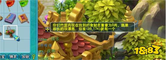完成任务后会获得花篮,回到小西天场景后点击花篮会显示食材坐标,食材重量达到100两后可完成该任务。