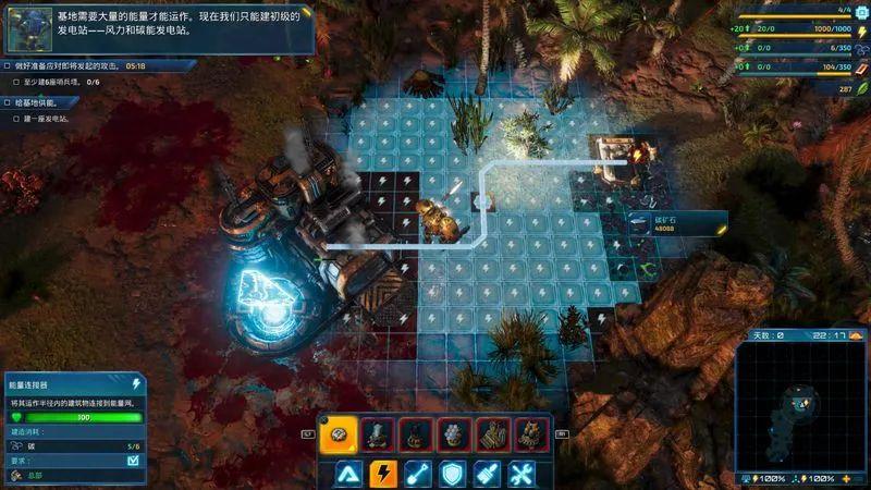 当一切具备了一定的雏形后,每个建筑物够开始各司其职,整个资源获取的过程没有任何拖沓阻塞的感觉。而让本作变得更加有意思的是一套“别具一格”的昼夜天气系统,这主要是针对矿物以外的另一关键能源“电能”做出的设计。在游玩的过程中会不时出现一些特殊天气以及昼夜的区分,不同的时间段都会让一些发电系统出现特殊的变数,这套机制并不难理解类似黑夜会让太阳能失去功能,而雷暴则会让风力发电功率翻倍,变数所发生的频率还是蛮高的,这也使得你需要随时关注地图的变化,从而针对性地做出合适的“答题思路”。