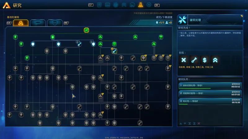 另外,本作的教程部分并没有覆盖地太过全面,一些基础的东西你可以在序章里找到,但在这曾基础稍微往上一点的东西,比如可以视为游戏玩法规则的提高资源储备上限的方法,在流程里并没有告诉你应该怎么去实现,诸如此类还有科技树的解锁以及玩法等等,在流程模式下当你接到了对应的任务,很可能会一头雾水,最后只能逐一去建筑和系统菜单里自行摸索。