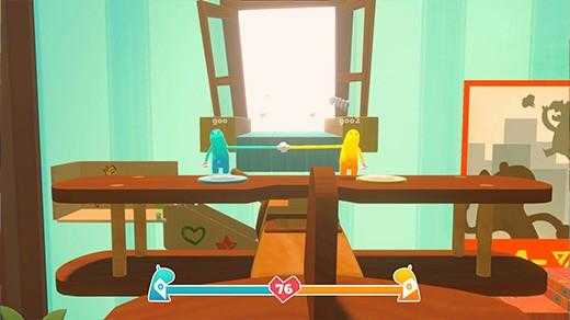 •游戏关卡部分,将会采用玩具屋型的可爱设计氛围,玩家们需要共同度过关卡上的种种难关,例如像是越过有着高低差的障碍,或是透过跳跃闪躲迎面而来的障碍物,或是搬运对象作为垫脚石来穿越阻断的通路等等。 而游戏最大的难度,就在于两名玩家角色一旦分离超过一定距离,牵着的手就会分开,游戏就会直接Game Over结束!
