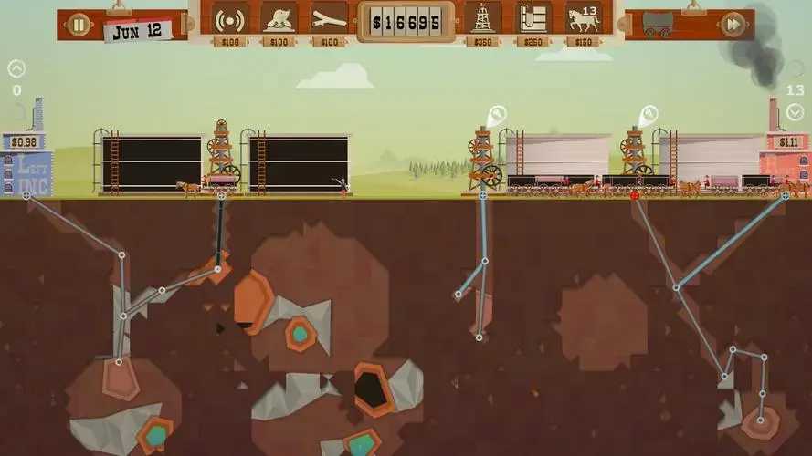 这是一款模拟经营类游戏,游戏中你将经营一个小企业,需要你去不断地经营自己的石油开采业务。从刚开始的找到油田,建造油井,再到扩大油井规模,不断扩大,最终走向人生巅峰!但是,如果你没有经营好你的企业,那么你也可能直接破产。虽然听着很简单,但是实际游玩却会让你十分上头!