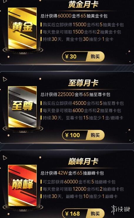 如图所示,类似NBA,月卡分为三档,但区别于NBA,月卡三档都是金币,而不像NBA的中间档是钻石月卡。