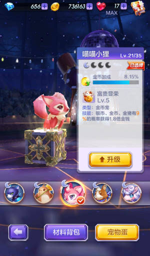 同样是将金币加成放在首位,小编推荐大家选择喵喵小狸。