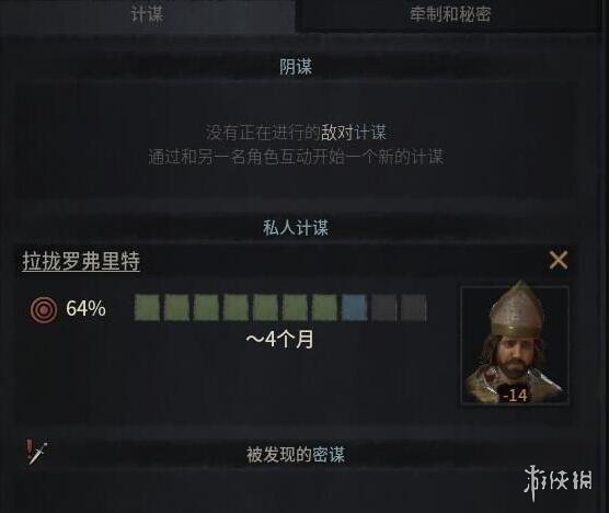 在谋略菜单中可以看到针对玩家的(例如被内阁间谍首脑系统发现)各种计谋以及自己自定的计谋、阴谋,这些谋略的成功率依赖于相关能力以及同盟的能力。