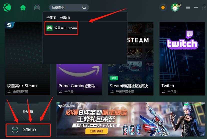 1.迅游左下角点击【充值中心】然后右下角兑换码输入【白嫖迅游加速】可得5天加速时长,一定要记得去兑换使用哦。在迅游加速器客户端搜索“坟墓高中”,选择后点击加速即可,这一步不加速的话可能会打不开Steam商店并且无法成功进入游戏。