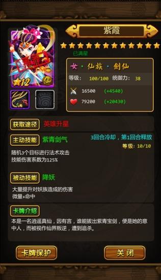 紫霞:主角地位的仙族紫卡,性价比和实用性堪称王者。被动技能为降妖,完克各种妖族卡牌。在斗法、锁妖塔、封神榜、副本推图中都发挥着不可替代的作用。而且作为初始卡牌最大的优点就是培养简单,通过斗法点兑换也可以在短期内升到10星哦。