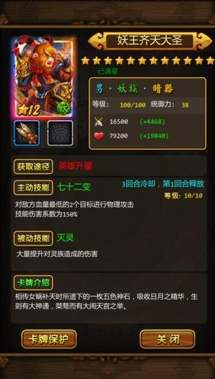 妖王齐天大圣:第二张精元类闪卡,魔神六耳的主力输出者,拥有灭灵技能,需要700精元兑换,积累周期较长,值得长期培养。