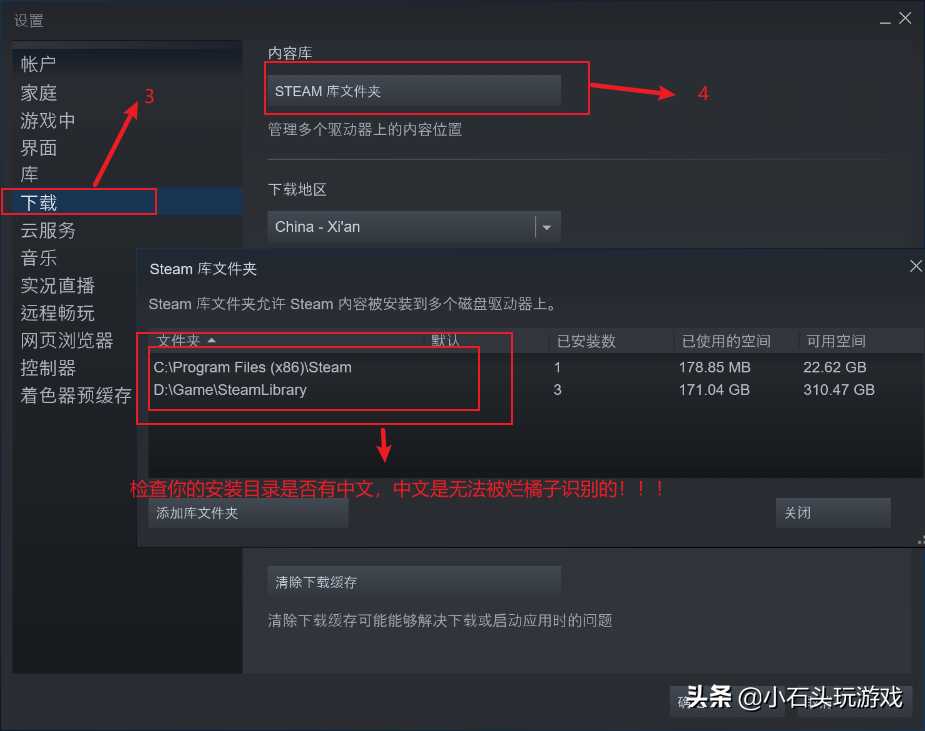 2.如果第一步还没有解决,那就要看你的steam安装目录是否有中文了!