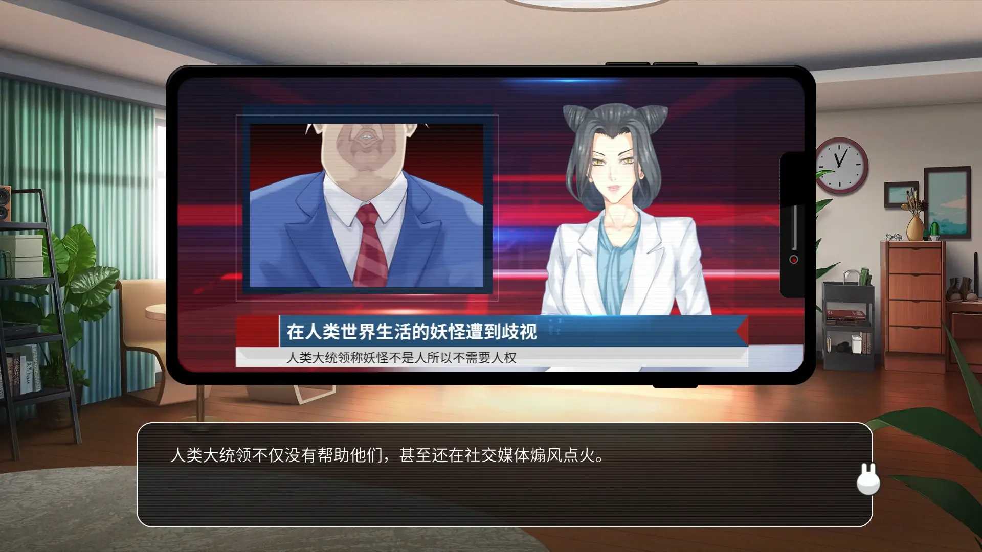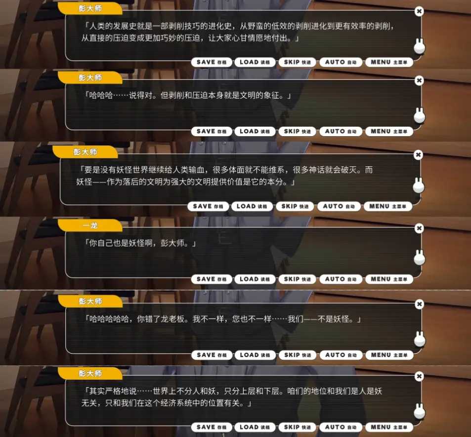 这些角色不仅仅是代表着他们个体,更是社会不同社会阶级的代表。游戏对于人物的社会属性和社会关系探讨相当深刻。这才是这个游戏作为gal最大的与众不同之处。在抽象层面,有着人物的对社会发展以及不同阶级的看法;在具象层面,游戏中也将人类与妖怪之间的矛盾通过新闻的方式连接在一起,在宏观层面一步一步推动矛盾升级。剧情就在这样的讨论以及发展中一步一步走向高潮。