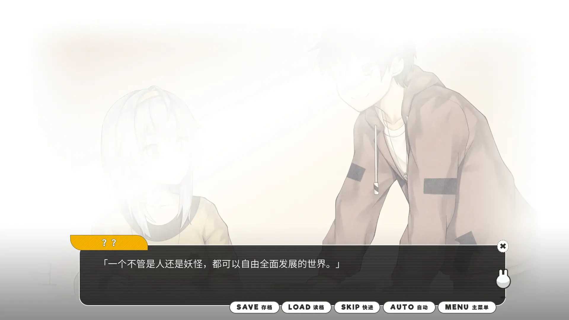 一群人(妖),向着这个伟大目标做努力,做挣扎。这故事并不完美,离完美还差着十万八千里,但它绝对不容错过,至少我认为,能在一款galgame看见“要创造一个没有剥削,没有压迫的,人人都可以自由发展的世界。”这句话时,它所带来那种的感动,是其他游戏无法比拟的。