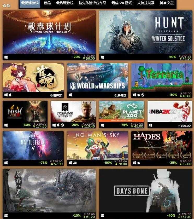 青铜:戴森球计划、猎杀:对决、雀魂、战舰世界、泰拉瑞亚、仁王2、十字军之王3、动物园之星、NBA 2K21、战地5、无人深空、黑帝斯、鬼谷八荒、往日不在、Raft、辐射76、足球经理2022、幸福工厂、坦克世界闪电战、F1 2021、光环:士官长合集、城市:天际线、尼尔:人工生命ver.1.22474487139…、DayZ、EA Play、人类、全面战争:战锤2、上古卷轴5:天际特别版、气球塔防6、NBA 2K22、森林、无主之地3、模拟农场22、壁纸引擎、罪恶装备STRIVE、只狼:影逝二度、博德之门3、深岩银河、帝国时代2决定版、辐射4、星球大战:旧共和国、以撒的结合:重生、生化变种、武装突袭3、神之浩劫、星露谷物语、巫师3:狂猎、猎人:荒野的召唤、环世界、破晓传奇、半衰期:爱莉克斯、糖豆人:终极淘汰赛。