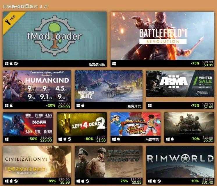 玩家峰值数量超过3万:泰拉瑞亚tModLoader、战地风云1、人类、坦克世界闪击战、武装突袭3、质量效应传奇版、求生之路2、英灵乱战、上古卷轴OL、文明6、钢铁雄心4、环世界、城市:天际线、怪物猎人物语2:破灭之翼、罪恶装备STRIVE、神之浩劫、米德加尔的部落、你画我猜、气球塔防6、戴森球计划、上古卷轴5:天际特别版、文明5、英雄连2、螃蟹游戏、猎杀:对决、永恒轮回、邪恶天才2、消逝的光芒、无人深空、幸福工厂、怪物猎人:世界、Garry’s Mod、群星、循环英雄、FIFA22、翼星求生、帝国时代2决定版、FIFA21、生化变种、梦幻之星2 OL:新创世纪、开拓者:拥王者、七日杀、枪火重生、巫师3:狂猎、深岩银河、雨中冒险2、僵尸毁灭工程、Raft、模拟农场19、DayZ、辐射4、黑帝斯、仁王2。