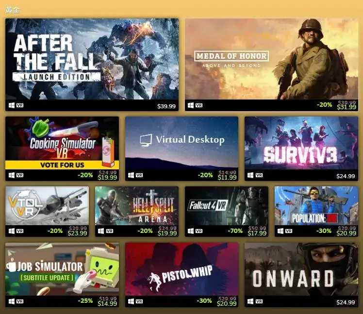 黄金:After the Fall、荣誉勋章:超越巅峰、烹饪模拟器VR、虚拟桌面、SURV1V3、VTOL VR、地狱分割:竞技场、辐射4VR、POPULATION: ONE、工作模拟器、Pistol Whip、Onward。