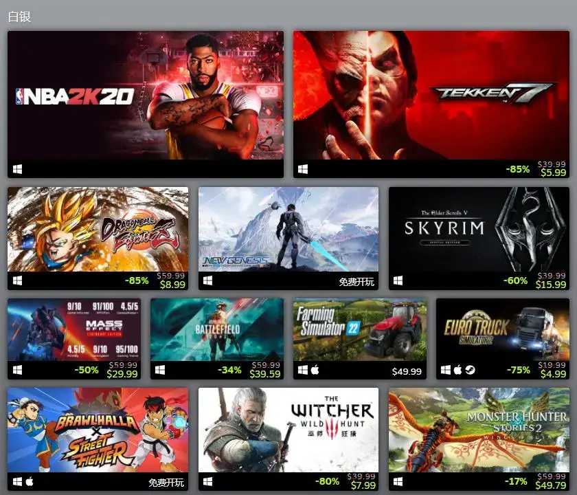 白银:NBA 2K20、铁拳7、DRAGON BALL FighterZ、梦幻之星2 OL:新创世纪、上古卷轴5:天际特别版、质量效应传奇版、战地风云2042、模拟农场22、欧洲卡车模拟2、英灵乱战、巫师3:狂烈、怪物猎人物语2:破灭之翼、NBA 2K22、只狼:影逝二度、月姬格斗:TYPE LUMINA、F12021。