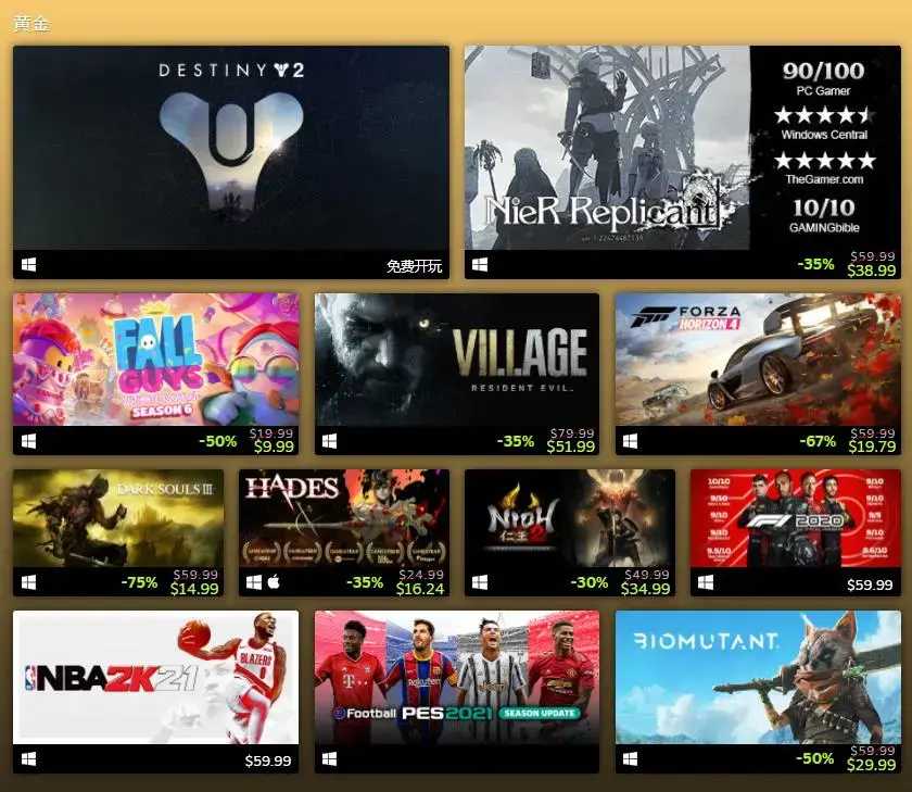 黄金:命运2、尼尔:人工生命ver.1.22474487139…、糖豆人:终极淘汰赛、生化危机:村庄、极限竞速:地平线4、黑暗之魂3、黑帝斯、仁王2、F1 2020、NBA 2K21、实况足球2021、生化变种。