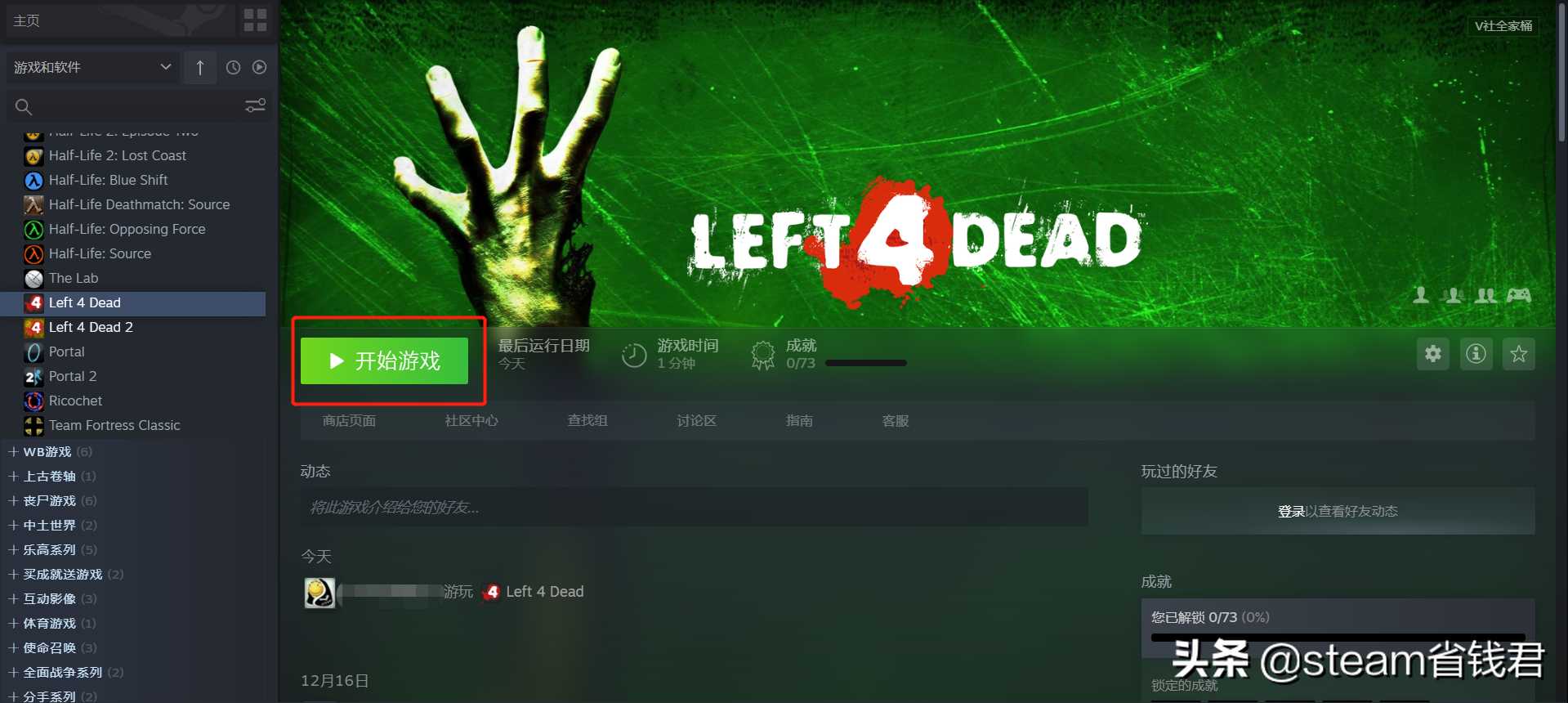 1.打开steam平台,点击左上角“库”通过搜索找到求生之路,点击“开始游戏”。